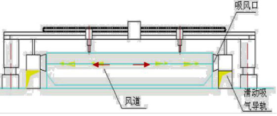 在切割平臺兩側(cè)安裝方形吸風道,吸風道上方裝有一個可隨切割機一起移動的滑動吸風小車(每個切割機兩個)?;瑒游L小車、切割頭、安裝在切割機沿橫梁方向的同一直線上。利用切割平臺上的格柵板與被切割鋼板形成煙氣通道,切割鋼板時,產(chǎn)生的切割煙塵通過該煙氣通道由風機負壓作用流向滑動小車吸風口,進入方形吸風道,最后進入凈化器主機進行切割煙塵凈化處理。