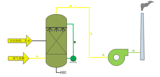 酸(堿)廢氣由風管引出后,進入廢氣凈化塔(逆流式洗滌塔)進行凈化處理,凈化塔內裝填有一定的填料,這樣可以使廢氣和吸收液充分接觸,從塔上流下來的水再通過水泵提升到塔頂,不斷循環(huán)利用,循環(huán)液在達到一定濃度后再排向污水處理系統(tǒng)統(tǒng)一排放。