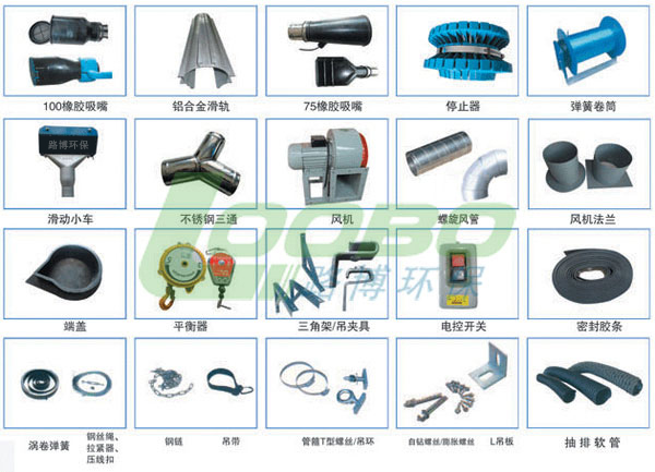 本套系統(tǒng)采用鋁合金導(dǎo)軌,導(dǎo)軌每隔一定距離配1套滑車,每套滑車配進(jìn)口吸氣臂軟管一根,使用圓橡膠吸口或者扁橡膠吸口。